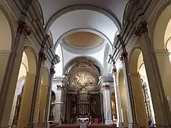 El interior presenta tres naves intercomunicadas por arcos de medio punto, con cabecera plana y transepto con cúpula, así como capillas laterales. La nave central es de mayores dimensiones que las laterales y está cubierta por bóvedas de medio punto, con arcos torales que se sostienen sobre pilares cuadrados de orden corintio. Las naves laterales están cubiertas con bóvedas vaídas. El crucero está coronado por una cúpula sobre conchas sin tambor. El presbiterio es de cabecera plana, a ambos lados del cual hay dos capillas.[5]