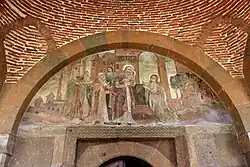 Frescos de clérigos debajo del pórtico en el frente de la iglesia.
