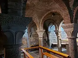 Se encuentra bajo el presbiterio y se accede a ella por dos escaleras situadas a ambos lados de la nave. Se trata de una pequeña estancia de tres naves y cuatro tramos, divididos por 18 columnas. Fue destruida en la Guerra Civil y reconstruida con posterioridad juntamente con el resto del templo. Seis capiteles son originales y el resto modernos, por lo que aparecen marcados con una "R". La bóveda, tras la restauración, es de hormigón armado y ladrillo.