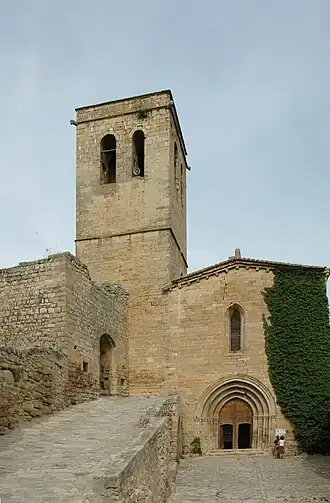 La fachada tiene una portada con cuatro arquivoltas góticas con arcos apuntados, donde se pueden ver los escudos de las familias Alemán y Rocabertí. Encima hay un ventanal de tipo ojival. En la parte izquierda hay adosado un campanario de torre cuadrado que en la parte superior tiene el escudo de la familia Castro-Pinós.