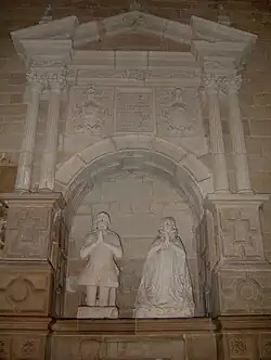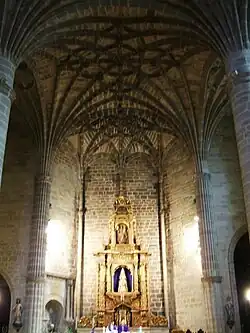 La construcción de la iglesia arrancó en 1523 y finalizó cincuenta años más tarde, en 1571. Es una obra de estilo renacentista pero con algunos detalles del gótico más tardío, toda ella en sillería de piedra caliza. Se trata de una iglesia con planta de salón o hallenkirche que consta de tres naves de tres tramos y a la misma altura, coro elevado a los pies de la nave principal y bóvedas de crucería estrelladas de terceletes y combados. Las bóvedas son soportadas por 16 columnas: 12 están adosadas a lo largo de los lienzos perimetrales y presentan fuste acanalado, dando prolongación en forma de moldura a los numerosos nervios que convergen desde la plementería; los cuatro soportes principales son pilares columnarios lisos.