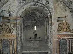 El presbiterio está construido sobre una cripta que consta igualmente de tres ábsides y esta cubierta con bóveda de cañón. La nave presenta dos capillas a los lados y un coro de madera a los pies, así como una sacristía a la que se accede desde el presbiterio sur.