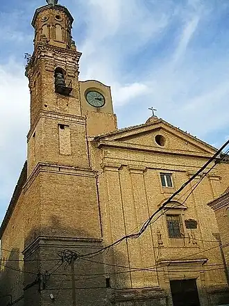 Su aparejo de ladrillo, típico de las construcciones religiosas de la Ribera Navarra y el bajo Aragón, produce en este caso una recia fábrica de austero aspecto exterior. La única elaboración artística se encuentra en la fachada principal, orientada al oeste. Presenta ésta un gran imafronte a manera de templo clásico, con puerta adintelada, cornisa y ventanal con pequeño frontón semicircular, todo ello dispuesto en un paño vertical que flanquean cuatro pilastras prismáticas de orden toscano y que cubre un entablamiento con arquitrabe y friso liso, y un frontón con un óculo abierto. La torre, adosada en el lado izquierdo, presenta cinco cuerpos de anchura decreciente separados por cornisas molduradas y con triglifos; los cuatro primeros cuerpos son prismáticos, mientras que el superior tiene sección octogonal, con óculos y campaniles que actualmente están cegados.