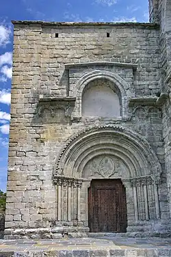 El portal es de medio punto con seis arquivoltas con el trasdós dentado con puntas de diamante. Por encima de la puerta hay un tímpano con un pantocrátor dentro de una mandorla sostenida por dos ángeles y sosteniendo el libro LUX MUNDI.