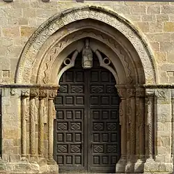 Está construida con sillares de piedra bien labrados. Del exterior destaca su fachada principal, conformado por un arco apuntado con cuatro arquivoltas, guardapolvo, imposta y ocho columnas con los fustes decorados (con entrelazados, dameros, rombos..) y sus capiteles. Su clave está decorada con una imagen de la Virgen María orlada con tracería de estilo gótico. Encima tiene un pequeño rosetón que termina la portada. También otras dos portadas de menos importancia en sus laterales que presentan una disposición arcaizante de arco de medio punto con guardapolvo, impostas y columnas con capiteles en los acodamientos de las jambas.