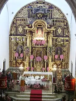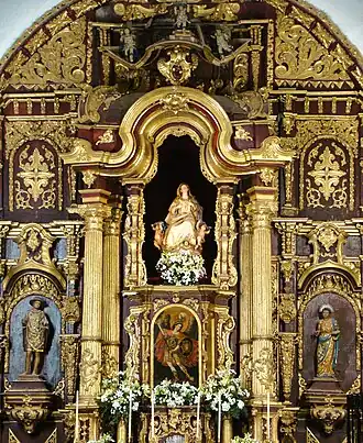 En el retablo mayor, fechado en el siglo XVIII (1732-1740), llaman la atención cuatro columnas que soportan un arco mixtilíneo. El conjunto tiene como imagen principal a la Virgen María, y a su derecha e izquierda Santa Lucía y San Lázaro respectivamente.