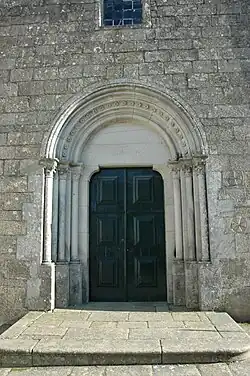 Es una construcción de una sola nave encabezada por un ábside rectangular. El campanario cuadrangular, la capilla y la sacristía rectangulares se encuentran adosados al muro sur. La fachada principal contiene un portal con arcos de medio punto y tres arquivoltas apoyadas en los capiteles que rematan sendas columnas.