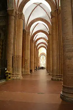 El interior se caracteriza por una penumbra inspiradora, y es de planta de cruz latina con una nave y numerosas capillas laterales con frescos y pinturas[2]. Los más importantes son: