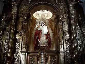 Este retablo barroco consta, de banco muy retallado con temas florales, al igual que las calles laterales, donde se alberga el sagrario de plata, flanqueado por las tallas de San Pedro y San Pablo. Las imágenes se encuentran enmarcadas por pares de columnas de orden dórico y luego sigue un cuerpo, enmarcado por dos columnas salomónicas, con basa ática. En la parte superior hay tallas de serafines. Recientemente se le ha añadido un crucifijo, atribuido a Juan de Mesa, fechable hacia 1620.[24]