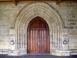 En el muro oeste de la iglesia se abre un rosetón con vidriera del siglo XIX.