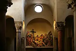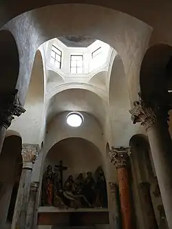 El sacelio de San Sátiro, llamado también «capilla de la Piedad» (cappella della Pietà) tras las intervenciones renacentistas, presenta una planta rectangular con ábsides en tres lados superpuesta a un cuadrado con columnas perimetrales: elementos que, junto con los fragmentos de frescos de época carolingia, constituyen el núcleo originario de la construcción.[45] Algunas de las columnas perimetrales, de piedra y decoradas con capiteles corintios, fueron tomadas de edificios de la ciudad de época tardo-romana y colocadas en el sacelio, mientras que otras son de arcilla y datan de las intervenciones de Bramante, al igual que las columnas alternativamente de mármol rojo de Verona y mármol cipollino sobre las cuales se apoyan los arbotantes situados al lado de las bóvedas angulares y la linterna situada en la cima de la estructura.[46]