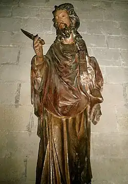 En el muro opuesto, otra magnífica imagen gótica del siglo XIV, de estilo similar, representa a san Bartolomé. Realizada en piedra policromada, a excepción de la mano derecha y el cuchillo, que han sido repuestos en madera, su posición es más dinámica que la de Santiago, ya que avanza con la rodilla moviendo el manto hacia adelante y enriqueciendo las líneas del contorno. Excelente es también el tratamiento dado al rostro con cejas arqueadas, ojos almendrados y boca entreabierta. La barba, separada del cuello, está tratada con gran detallismo y formada por trazos sinuosos.