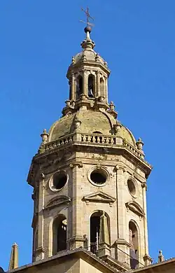 La torre, situada junto a la cabecera, por el lado de la Epístola, arranca con un cuerpo prismático del siglo XVI, dividido en dos secciones. El remate de la torre fue realizado entre 1776 y 1778, en un elegante estilo barroco tardío de sobrias líneas clasicistas, por Santos Ángel de Ochandátegui, colaborador del célebre arquitecto neoclásico Ventura Rodríguez. Consiste este en un cuerpo octogonal, articulado por pilastras jónicas ejecutadas con sillería escodada, entre las que se abren medios puntos para las campanas, rematados por frontones triangulares y curvos alternadamente y, sobre ellos, óculos, rematándose con un entablamento completo. Una balaustrada de piedra da paso a la cúpula nervada que prolonga la estructura octogonal del cuerpo de campanas con sus correspondientes óculos. Remata una linterna articulada por un orden corintio y una pequeña cúpula. Jarrones pétreos se disponen en los ángulos. Este modelo parece inspirado en las torres barrocas riojanas de Santa María la Redonda de Logroño. Una estancia de planta cuadrangular cubierta con una bóveda de terceletes con combados da paso a la escalera de caracol de acceso al campanario. Esta estancia pudo funcionar como sacristía antes de la construcción de la actual. Ochandátegui construyó también la lonja o atrio que cierra la iglesia hacia la calle Mayor. Está formada por pilares cajeados rematados en florones unidos por rejas de hierro. También en el siglo XVIII se construyó el claustro, la sacristía y la sala capitular.