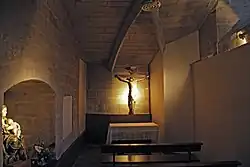 En el ático, San Antonio Abad, Santa Tecla, y en el centro una crucifixión con San Juan y la Virgen a los pies.