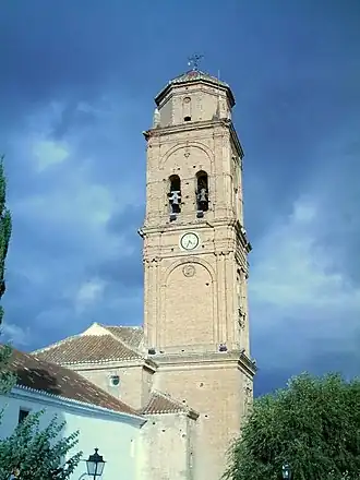 Entre 1760 y 1780 se levanta la torre-campanario situada junto a la cabecera. Su monumentalidad y riqueza ornamental contrasta con la sencillez de las fachadas del templo. Construida en ladrillo visto, se compone de tres cuerpos y remate ochavado. Presenta similitudes con otras de la zona como la de la iglesia de La Calahorra, inspirada también en la Catedral de Guadix.