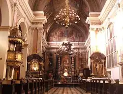 El interior de la iglesia es una sala grande. Está construida como basílica, prolongada con el coro, casi tan ancho como la nave. Las capillas son más oscuras que la nave, a causa de los cuadros de los altares que cubren las ventanas. Para la fabricación del altar principal los agustinos pidieron apoyo a Luka Mislej y, tras su muerte, a Francesco Robba, que terminó al altar en 1736.