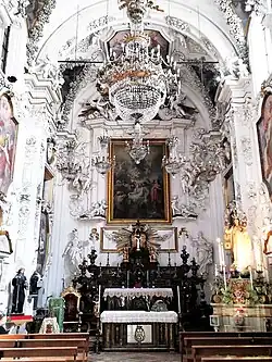 Presbiterio con ábside rectangular delimitado por arco de triunfo. El altar mayor ad Deum en piedras duras y semipreciosas, ágata y lapislázuli tiene dos escalones con jarrones laterales y dos estatuas de estuco: la Fe y la Caridad de Procopio Serpotta. En el edículo de la parte elevada destaca la pintura de ' Asunción de Giuseppe Patricolo de 1800, en la cornisa del luneto del arco absidial se encuentra la Gloria del Padre, obra en estuco de Giuseppe y Procopio Serpotta. La bóveda alberga un fresco que representa a Santa Teresa venerando a la Virgen Coronada. Sobre la mesa del sagrario está coronada por la figura de Jesús resucitado rodeado de rayos de luz.