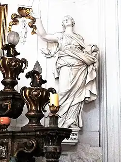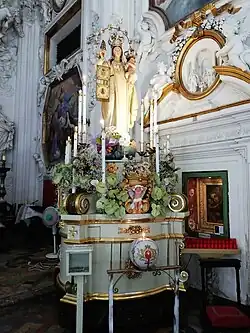 Capilla de Santa Teresa de Ávila. En el altar, la pintura que representa a Santa Teresa indica el monasterio de San Giuseppe de Gaspare Serenari, bordeado por las alegorías en estuco de la Divina Sabiduría y la Fortaleza. Sobre la mesa se coloca una estatuilla de madera policromada del siglo XVIII que representa a la Inmaculada Concepción. Frente al sagrario del altar, los bustos de madera policromada de Santa Teresa de Ávila y San Juan de la Cruz, de escuela napolitana.