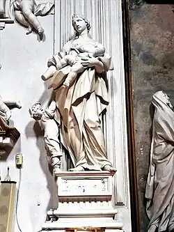 - Nicho que contiene la pintura que representa a la Virgen de la Salud, delimitado por un tímpano de arco quebrado con un teatro oval intermedio rematado por el fresco de Santa Teresa y San Juan de la Cruz. Cerca del arco de triunfo se sitúa el paso con una estatua de madera de María Santissima della Mercede atribuida a Rosario Bagnasco de 1910.