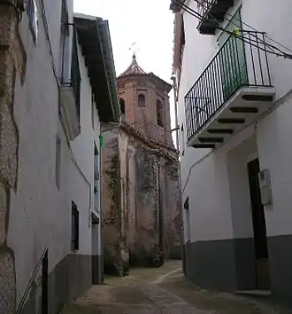 Alrededor de la nave se disponen diversas construcciones dependientes de la parroquia: tras la crujía que aloja el presbiterio se sitúa la sacristía y sobre esta un desván almacén. Al lado del evangelio, junto a la cabecera, se añade la capilla de la Comunión, que es de planta rectangular y se cubre con una bóveda de cañón tabicada. En el mismo lado, a los pies, está situada la torre campanario. Esta es de planta cuadrada, consta de dos cuerpos y se remata con un capitel, de planta octogonal de teja, presentando en su conjunto una imagen mudéjar. A los pies de la iglesia, junto a la torre, se sitúa la casa abadía. Por último en su fachada al sur se añade un porche que protege la entrada lateral y cubre el callizo que rodea la iglesia por ese lado. Al porche se accede a través de dos arcos apuntados situados en los extremos del cobertizo.