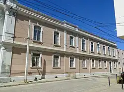 De estilo neoclásico y neorrenacentista, su fachada está compuesta de un cuerpo afrontonado que se apoya en seis columnas corintias, con los ingresos rematados por arcos de medio punto.[5]