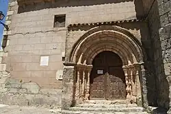 La portada se sitúa en el muro sur del edificio y constituye un claro ejemplo de la sobriedad característica del románico. Se compone de cuatro arquivoltas lisas: tres reposan sobre columnas acodilladas, mientras que la exterior se apoya directamente en jambas de sección prismática. Los capiteles, de formas alargadas y labra minuciosa, están decorados con motivos vegetales, predominando las hojas de acanto, semejantes a las que pueden observarse en iglesias cercanas, como Carabias o Saúca. Sobre estos se disponen cimacios decorados con una banda vegetal, de la que brotan hojas dispuestas en grupos de tres. Todo el conjunto queda enmarcado por una chambrana de perfil nacelado que refuerza la unidad formal de la portada.