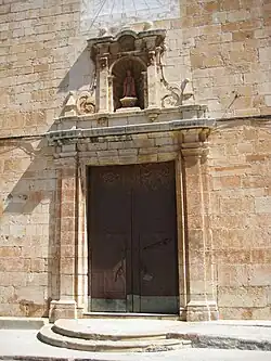 La fachada principal, a los pies de la iglesia, tiene perfil mixtilíneo, y puerta adosada la torre campanario junto a la Epístola. Este frontis está centrado en una sencilla portada, con apertura de arco de dintel y perímetro moldurado, protegida por pilastras dóricas que soportan un Entablamento, y por arriba, una hornacina apechinada con la imagen del patrón de la población, Sant Blas, enmarcada por pilastras y cubierta por una cornisa mixtilínea. Encima un reloj de sol del siglo XIX, y por sobre, una ventana.[3]
