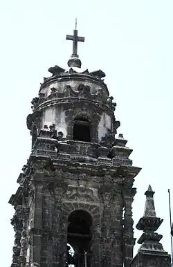 La torre se eleva al lado de la fachada principal.[4] Está rematado por una gran escultura de la corona papal, que representa la autoridad suprema del papado. Contiene columnas estípites que nunca fueron terminadas y son únicas entre las iglesias de la Ciudad de México.[5]
