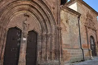 La portada principal es de estilo gótico. Flanqueada por pimáculos a ambos lados. Tiene un arco exterior, de estilo ojival conopial, con florituras góticas y bustos y relieves de caballeros y santos. Los arcos interiores tienen arquivoltas. El tímpano tiene decoración vegetal y un relieve de la Santísitima Trinidad de estilo noreuropeo; Dios Padre abranzando al Cristo y la figura del Espíritu Santo.