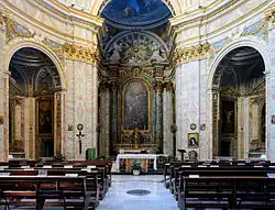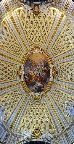 El techo abovedado está dividido en ocho segmentos de nervios radiales en cuyo óvalo central, rodeado de un marco dorado decorado con cuatro cabezas de querubines obra de Pietro Pacilli, representa una alegoría de "La misión de la Orden Trinitaria" pintada en 1748 por Gregorio Giuglielmi, autor también del fresco que representa "La Virgen María en coro entre los Padres Trinitarios Calzados de Castilla" que se encuentra sobre la bóveda del coro.