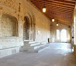 El pórtico sigue en todos los detalles la estructura de la vecina iglesia de San Miguel, sólo queda, de su disposición original, la puerta y dos tramos, uno de dos arcos y otro de tres.
