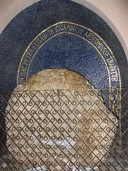 El gran mosaico, que rompe la monotonía de la piedra blanca con sus colores, fue diseñado por B. Biagetti y ejecutado en los estudios del Vaticano.