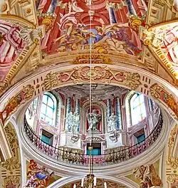 El interior de la iglesia se encuentra profusamente decorado con elementos arquitectónicos y pinturas en pared y techo. El altar mayor está coronado con una representación de la última cena de mediados del siglo XVIII.[1]