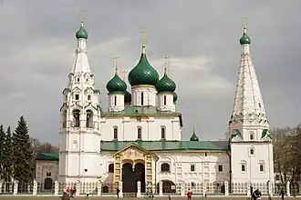La iglesia del Profeta Elías sorprende por la variedad de sus elementos. Es un "cubo" con tres ábsides coronados por cinco cúpulas. Cuatro pilastras cuadradas soportan las bóvedas. Esta planta muy simple se asemeja al de las iglesias premongolas en la región de Vladimir y Súzdal. Una paperte larga corre a lo largo de la iglesia "fría" al oeste y al norte; en el lado sur, la galería se ensancha para formar la iglesia "caliente". Varias capillas en miniatura están adosadas a la iglesia. En la esquina noroeste se encuentra un alto campanario en pirámide.[6] A pesar de la disparidad algo chocante, la armonía se basa en el equilibrio de las masas. La ornamentación exterior de la iglesia es relativamente sobria. La decoración exterior se reduce a la fayenza, algunas de las cuales están dispuestas en chirinki. Esta sobriedad realza la magnificencia del interior totalmente recubierto de frescos que representan escenas de la vida. El iconostasio, los contornos de los portales, los objetos de culto son de gran riqueza decorativa.