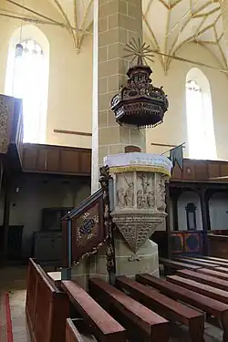El púlpito de arenisca el pilar del sudeste tiene varias partes. Tres relieves en la tribuna contienen escenas de la vida de Jesús: la Bendición de María, la Crucifixión de Jesús y el Monte de los Olivos. Otras dos superficies están decorados con tracería. En la base del púlpito se indica grabado el año 1596. Es obra, alrededor de 1500 de Ulrich de Brașov, con influencias del sur de Alemania. Un bello tornavoz barroco, ricamente tallado y chapado en oro, corona el púlpito, y puede ser datado en 1754.