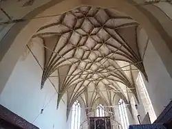 El coro y la sacristía de dos pisos tienen bóvedas reticuladas. La nave de cuatro tramos, formada por tres naves de casi la misma altura, está cubierta por una bóveda estrellada, las nervaduras de la bóveda (de estuco) convergen sin claves. Tres pares de pilares octogonales sostienen la bóveda, cuyas nervaduras descansan en los muros laterales sobre ménsulas. Las áreas abovedadas entre las nervaduras están pintadas pintadas de marrón en el coro, la nave y la sacristía, y están subdivididas con juntas blancas, tienen además motivos de lengua pintados y rayas puntiagudas verdes en el coro.