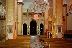 El interior de la iglesia tiene tres naves divididas por dos hileras de columnas. El conjunto está ricamente decorado con pinturas e iconos.
