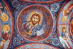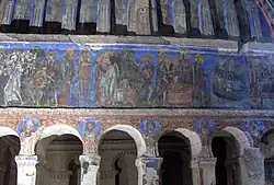 Una característica notable de esta iglesia es que la nave principal contiene un fresco del siglo IX en estilo "provinciano" y sus añadidos más recientes son los frescos de los tres ábsides del siglo XI dibujado en estilo "metropolitano". En los frescos están representados los doce apóstoles, los santos y escenas de la vida de Jesús (963-969 y siglo XI respectivamente). La iglesia también posee una cripta bajo la nave principal.