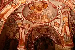 - La iglesia vieja data del siglo X. Originalmente era una iglesia de nave simple con bóveda de cañón. Pero su ábside fue destruido cuando se añadió la iglesia nueva a finales del siglo X o principios del XI. Ahora la iglesia vieja facilita la entrada a la nueva. La iglesia vieja está decorada con tonos pálidos de rojo y verde pintados en tiras para representar escenas del Nuevo testamento y descripciones de santos. El trabajo más elaborado de la Iglesia vieja es el ciclo cristológico localizado en la bóveda de cañón de una nave lateral de la basílica. En cada lado de la bóveda hay 32 escenas describiendo narraciones sobre la tradicional triple división de la vida de Cristo: la infancia, los milagros y la pasión.[2]