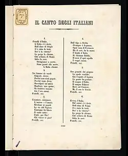 Il Canto degli Italiani (en español, «El canto de los italianos»), también conocido como el Inno di Mameli («Himno de Mameli») por el autor de la letra, o como Fratelli d'Italia («Hermanos de Italia») por su primer verso, es un canto de la época de la unificación italiana escrito por Goffredo Mameli y compuesto por Michele Novaro en 1847, que es, además, el himno nacional de la República Italiana.[1] La letra consta de seis estrofas y un estribillo que se repite al término de cada estrofa, y está musicalizado en un compás de 4/4 en la tonalidad de si bemol mayor.[2][3] La sexta estrofa retoma el texto de la primera con algunas variaciones.[3]