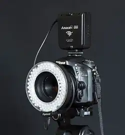 El flash anular o flash macro,[6] ya que se utiliza principalmente en la macrofotografía y ocasionalmente en retratos. Se le denomina así porque tiene forma de anillo o disco y se coloca alrededor de la parte exterior del objetivo. De esta forma, la luz es más difusa y uniforme.