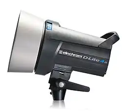 Los flashes de estudio se utilizan con un propósito profesional en estudios fotográficos únicamente debido a su tamaño. Estos se conectan directamente a la corriente eléctrica. Algunos modelos de flashes de estudio incluyen lo que se denomina luces de modelado, unas bombillas halógenas que están encendidas continuamente para que el usuario pueda prever las sombras aunque son de menor potencia que el flash. Igual que otros flashes, se acoplan fácilmente a trípodes y permiten acoplarle otros accesorios de iluminación como pantallas difusoras o paraguas.