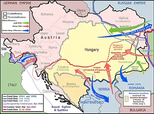 Unido al frente ruso, surgió en septiembre de 1916 un frente rumano, debido a la entrada en guerra de Rumanía en el bando aliado el 27 de agosto.[139] Pese a las amenazas de Ottokar Czernin, a la sazón embajador austrohúngaro en Bucarest, el Gobierno rumano entabló negociaciones con la Entente que concluyeron en acuerdo a principios del verano de 1916; las dos partes firmaron un tratado de alianza y se estableció un plan de intervención para el ejército rumano. La actitud de los rumanos transilvanos fue de apoyo a la invasión, lo que les granjeó el castigo del Gobierno húngaro cuando las tropas rumanas tuvieron que retirarse.[85] La población rumana de Transleitania, que hasta la invasión no se había mostrado levantisca, apoyó a las tropas del reino vecino.[147] Cuando estas se retiraron a causa del contraataque de los Imperios Centrales, unas ochenta mil personas, entre ellas gran parte de los intelectuales, marcharon con ellas.[147][85] La marcha de la intelectualidad y la represión magiar aseguró el dominio de Transilvania y Bucovina hasta el final de la guerra.[147]