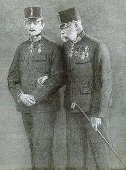 En un momento de tensión entre el poder civil y el militar en el reino de Serbia, unos súbditos austrohúngaros, miembros del movimiento de la Joven Bosnia que contaban con apoyo en Serbia, asesinaron al heredero de la corona austrohúngara, el archiduque Francisco Fernando de Austria, sobrino[49] del emperador Francisco José.[50] El atentado se produjo en la ciudad de Sarajevo, el 28 de junio de 1914.[51][52] El heredero, que mantenía tensas relaciones con el emperador, se hallaba en Bosnia asistiendo a unas maniobras militares y había aprovechado para hacer una visita oficial a la capital bosnia.[53] Sobrevivió a un primer atentado fallido con bomba, pero otro de los terroristas logró matarlo de un tiro cuando acudía a visitar a uno de sus edecanes, herido en el primer ataque.[54]