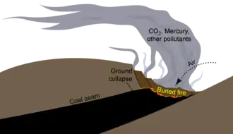 Los incendios de carbón son un peligro grave para la salud y la seguridad de la población, ya que afectan al medio ambiente al liberar gases tóxicos; pueden provocar la quema de pastos y matorrales o generar incendios forestales; y también pueden provocar el hundimiento de infraestructuras superficiales, como carreteras, tuberías, líneas eléctricas, soportes de puentes, edificios y viviendas. Ya sea porque los inicien los humanos o sean debidos a causas naturales, los incendios pueden prolongarse durante décadas o incluso durante siglos, hasta que se agota la fuente de combustible; se intercepta una capa freática permanente; la profundidad de la quema se vuelve mayor que la capacidad del suelo para hundirse y las llamas se quedan sin ventilación; o se produce una intervención humana. Debido a que se queman bajo tierra, los incendios de vetas de carbón son extremadamente difíciles y costosos de extinguir, y es poco probable que las lluvias los apaguen.[6] Existen fuertes similitudes entre los incendios de carbón y la combustión en las turberas.