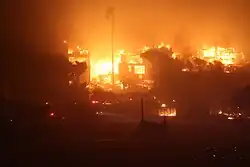 Se atribuyeron al menos veintiocho muertes a los incendios forestales y se informó que más de 100 estructuras fueron destruidas, dejando a numerosas personas damnificadas.[106][107][108][109] Se registraron varios casos de quemaduras, y un bombero de 25 años sufrió una «lesión grave en la cabeza».[110][111] Aproximadamente a las 9:00 p. m. PST, varias víctimas de quemaduras llegaron caminando al restaurante Duke's Malibu, donde recibieron atención médica antes de ser trasladadas a hospitales.[68]