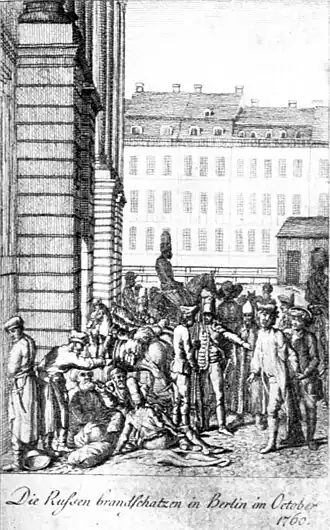 El 9 de octubre, el ayuntamiento decidió entregar la ciudad formalmente a los rusos en lugar de a los austriacos, ya que Austria era un enemigo más enconado de Prusia. Los rusos solicitaron de inmediato cuatro millones de táleros a cambio de la protección de la propiedad privada. Un importante comerciante, Johann Ernst Gotzkowsky, se hizo cargo de las negociaciones en nombre de Berlín y fue capaz de persuadir a Tottleben para que redujera el impuesto a 1,5 millones.[6] Mientras tanto, los austriacos se habían abierto paso en la ciudad y habían ocupado gran parte de ella.[7]