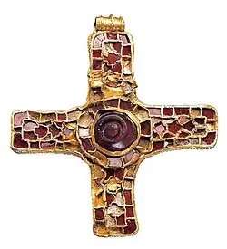 La riqueza de un anglosajón podría medirse por el número y variedad de prendas, accesorios y joyas que poseía y la calidad de esos artículos.[72] El estatus en la joyería se reflejaba en el tamaño, la complejidad y el uso del oro, la plata y el granate. Hombres y mujeres más ricos poseían calzado a principios de la era anglosajona, un período en el que muchos anglosajones probablemente iban descalzos. Los ricos a menudo tenían ropa nueva y usaban la última moda en ropa y accesorios.[73][74]
