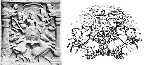 También se menciona a menudo como un posible ejemplo de la influencia helenística en el arte indio un famoso relieve de Bodh Gaya que muestra al dios indio Suria en una cuadriga.[41][42]