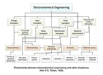La ingeniería electroquímica combina el estudio de la transferencia de carga heterogénea en las interfases de electrodos/electrolitos con el desarrollo de materiales y procesos prácticos. Las consideraciones fundamentales incluyen materiales de electrodos y la cinética de especies redox. El desarrollo de la tecnología implica el estudio de los reactores electroquímicos, su distribución potencial y actual, las condiciones de transporte de masa, la hidrodinámica, la geometría y los componentes, así como la cuantificación de su rendimiento general en términos de rendimiento de reacción, eficiencia de conversión y eficiencia energética. Los desarrollos industriales requieren más diseño de reactores y procesos, métodos de fabricación, pruebas y desarrollo de productos.